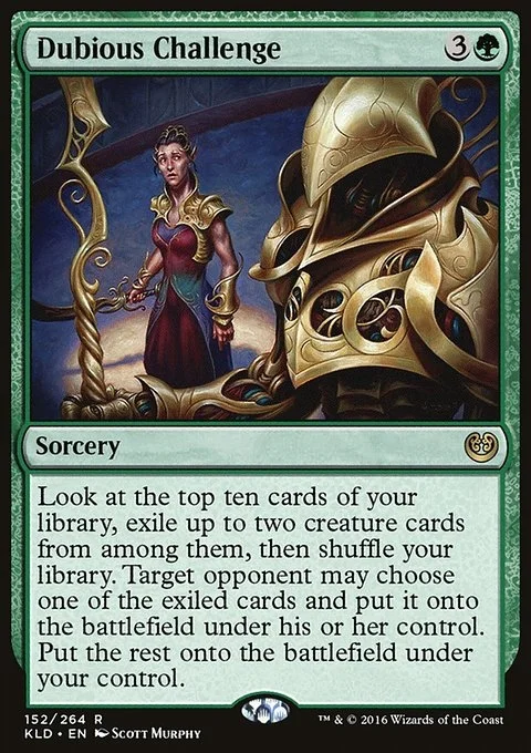 Look at the top ten cards of your library, exile up to two creature cards from among them, then shuffle. Target opponent may choose one of the exiled cards and put it onto the battlefield under their control. Put the rest onto the battlefield under your control.
