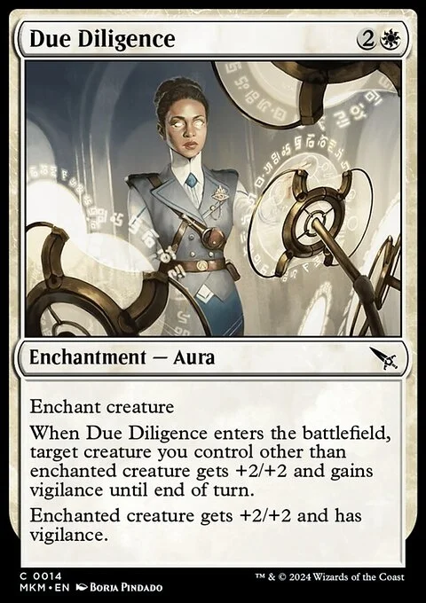 Enchant creature When this Aura enters, target creature you control other than enchanted creature gets +2/+2 and gains vigilance until end of turn. Enchanted creature gets +2/+2 and has vigilance.