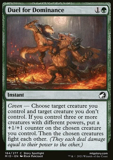 Coven — Choose target creature you control and target creature you don't control. If you control three or more creatures with different powers, put a +1/+1 counter on the chosen creature you control. Then the chosen creatures fight each other. (Each deals damage equal to its power to the other.)