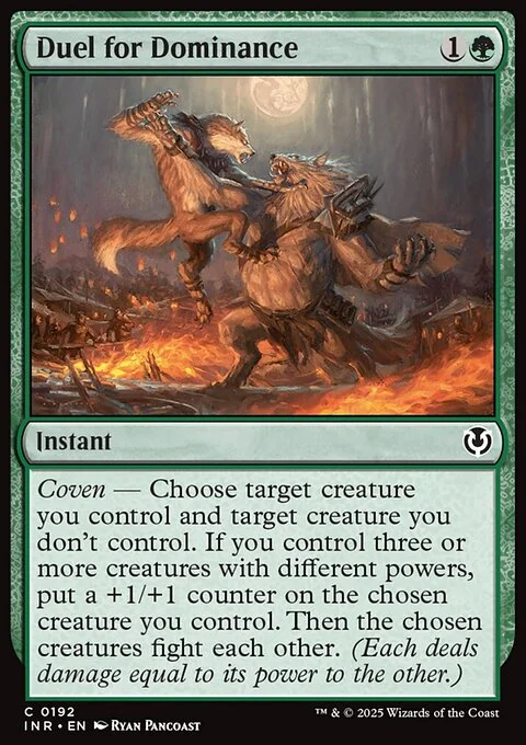 Coven — Choose target creature you control and target creature you don't control. If you control three or more creatures with different powers, put a +1/+1 counter on the chosen creature you control. Then the chosen creatures fight each other. (Each deals damage equal to its power to the other.)