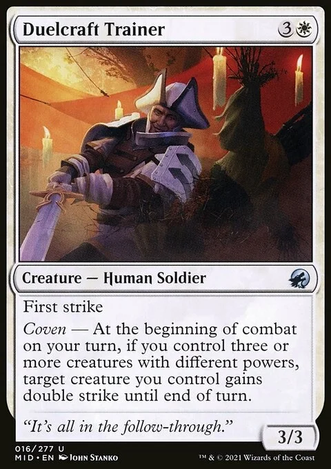 First strike Coven — At the beginning of combat on your turn, if you control three or more creatures with different powers, target creature you control gains double strike until end of turn.