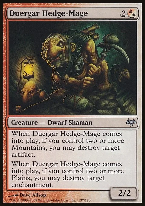 When Duergar Hedge-Mage enters the battlefield, if you control two or more Mountains, you may destroy target artifact. When Duergar Hedge-Mage enters the battlefield, if you control two or more Plains, you may destroy target enchantment.