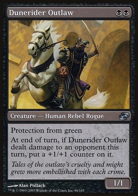 At end of turn, if Dunerider Outlaw dealt damage to an opponent this turn, put a +1/+1 counter on it.