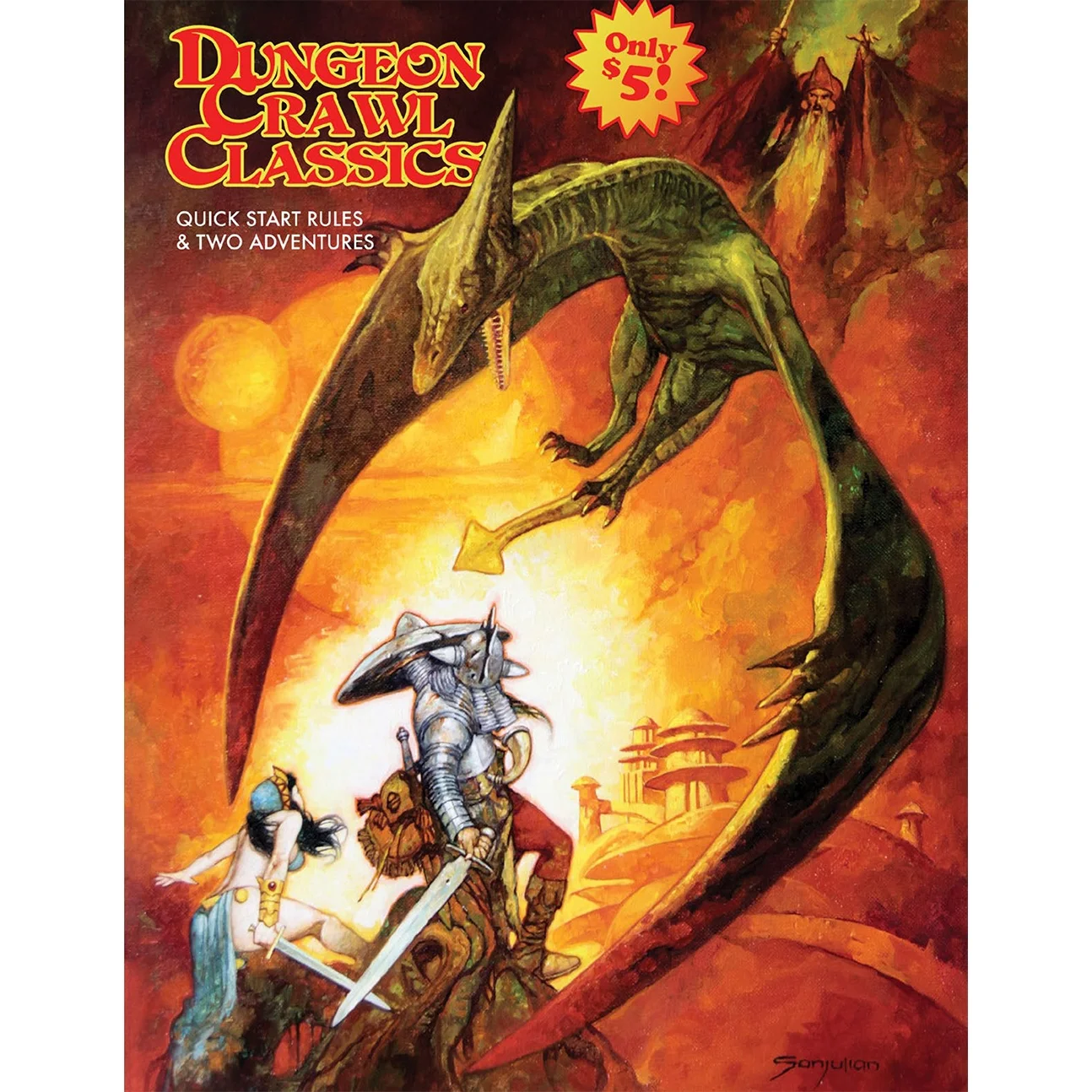 At long last, the Dungeon Crawl Classics Role Playing Game has an affordable quick start rules! The entire game is boiled down to a short QSR which has everything needed to play levels 0-2. In addition, this 48-page booklet includes not one but TWO adventures – the classic 0-level funnel "Portal Under the Stars" and a new adventure called "Gnole House" by Michael Curtis!