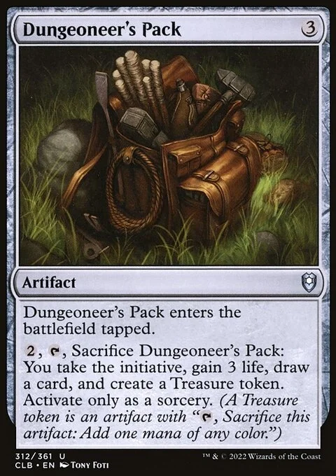 {2}, {T}, Sacrifice Dungeoneer's Pack: You take the initiative, gain 3 life, draw a card, and create a Treasure token. Activate only as a sorcery. (A Treasure token is an artifact with "{T}, Sacrifice this artifact: Add one mana of any color.")