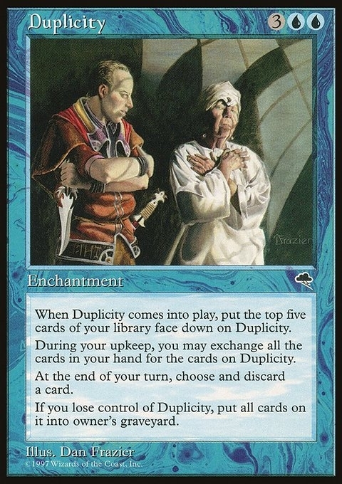 When Duplicity comes into play, put the top five cards of your library face down on Duplicity.During your upkeep, you may exchange all the cards in your hand for the cards on Duplicity.At the end of your turn, choose and discard a card.If you lose control of Duplicity, put all cards on it into owner’s graveyard.