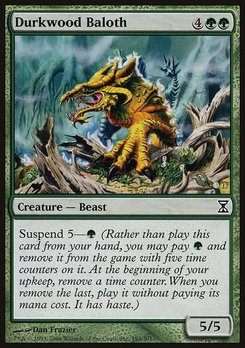 Suspend 5—{G} (Rather than cast this card from your hand, you may pay {G} and exile it with five time counters on it. At the beginning of your upkeep, remove a time counter. When the last is removed, you may cast it without paying its mana cost. It has haste.)