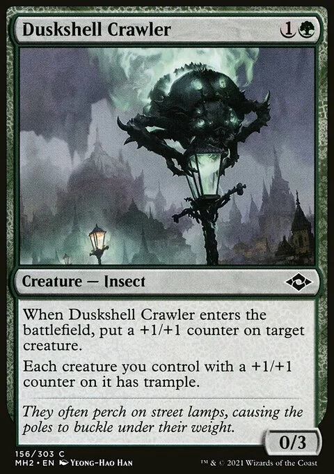 When Duskshell Crawler enters the battlefield, put a +1/+1 counter on target creature. Each creature you control with a +1/+1 counter on it has trample.