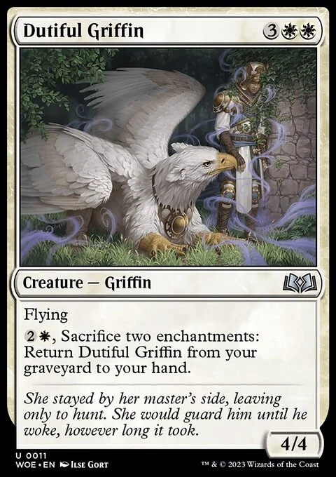 Flying {2}{W}, Sacrifice two enchantments: Return Dutiful Griffin from your graveyard to your hand.