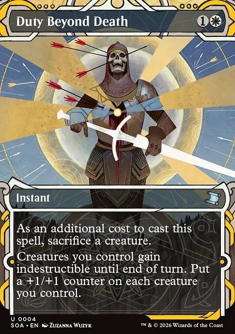 As an additional cost to cast this spell, sacrifice a creature. Creatures you control gain indestructible until end of turn. Put a +1/+1 counter on each creature you control. (Damage and effects that say "destroy" don't destroy those creatures.)