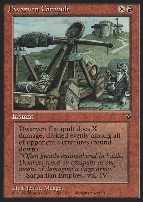 Dwarven Catapult does X damage, divided evenly among all of opponent’s creatures (round down).