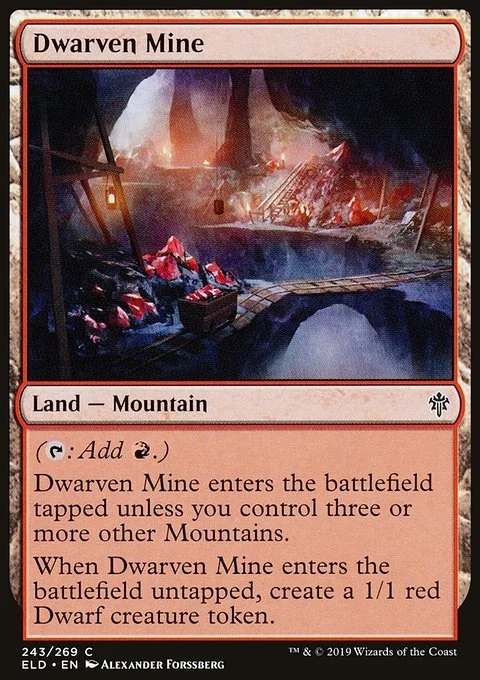 ({T}: Add {R}.) This land enters tapped unless you control three or more other Mountains. When this land enters untapped, create a 1/1 red Dwarf creature token.