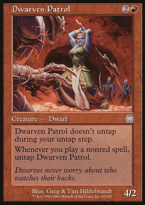 Dwarven Patrol doesn't untap during your untap step. Whenever you cast a nonred spell, untap Dwarven Patrol.