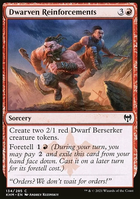 Create two 2/1 red Dwarf Berserker creature tokens. Foretell {1}{R} (During your turn, you may pay {2} and exile this card from your hand face down. Cast it on a later turn for its foretell cost.)