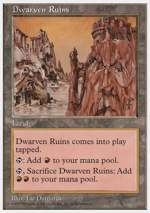 Dwarven Ruins comes into play tapped.T: Add B to your mana pool.tap, Sacrifice Dwarven Ruins: Add RR to your mana pool.