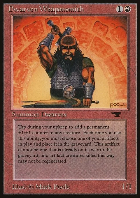 Tap during your upkeep to add a permanent +1/+1 counter to any creature. Each time you use this ability, you must choose one of your artifacts in play and place it in the graveyard. This artifact cannot be one that is already on its way to the graveyard, and artifact creatures killed in this way may not be regenerated.
