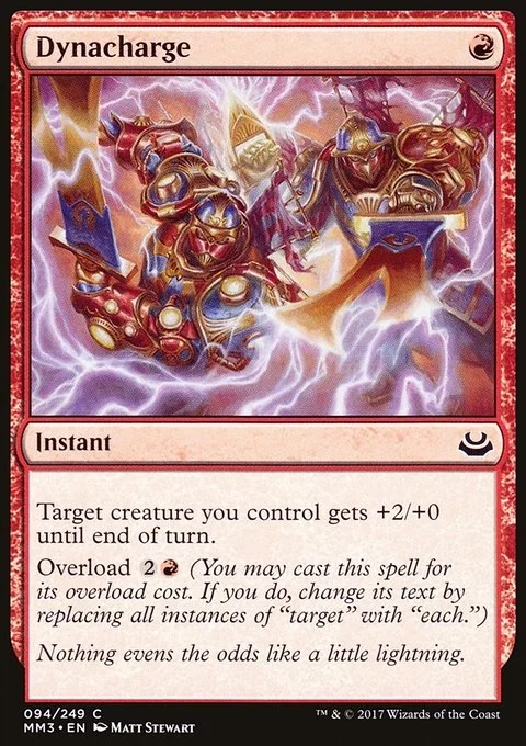 Target creature you control gets +2/+0 until end of turn. Overload {2}{R} (You may cast this spell for its overload cost. If you do, change "target" in its text to "each.")