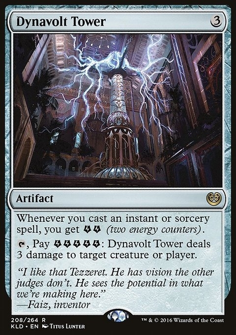 Whenever you cast an instant or sorcery spell, you get {E}{E} (two energy counters). {T}, Pay {E}{E}{E}{E}{E}: Dynavolt Tower deals 3 damage to any target.
