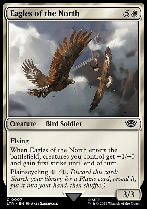 Flying When this creature enters, creatures you control get +1/+0 and gain first strike until end of turn. Plainscycling {1} ({1}, Discard this card: Search your library for a Plains card, reveal it, put it into your hand, then shuffle.)
