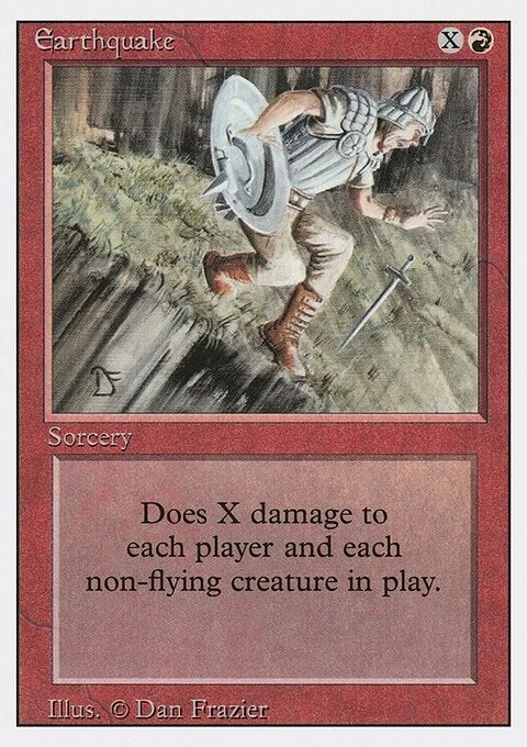 Does X damage to each player and each non-flying creature in play.