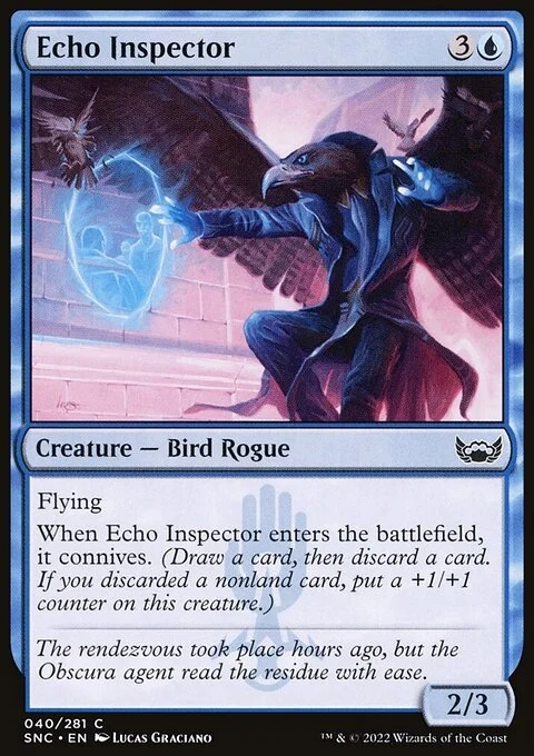 Flying When this creature enters, it connives. (Draw a card, then discard a card. If you discarded a nonland card, put a +1/+1 counter on this creature.)