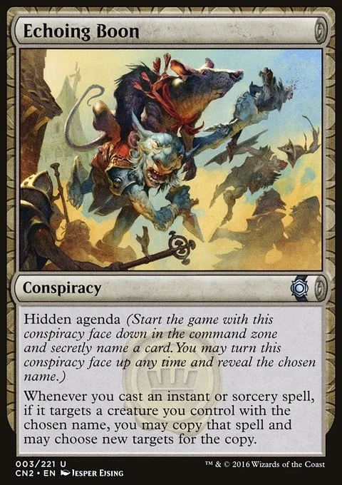 Whenever you cast an instant or sorcery spell, if it targets a creature you control with the chosen name, you may copy that spell and may choose new targets for the copy.