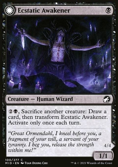 Ecstatic Awakener {2}{B}, Sacrifice another creature: Draw a card, then transform this creature. Activate only once each turn. Awoken Demon