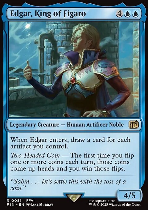 When Edgar enters, draw a card for each artifact you control. Two-Headed Coin — The first time you flip one or more coins each turn, those coins come up heads and you win those flips.