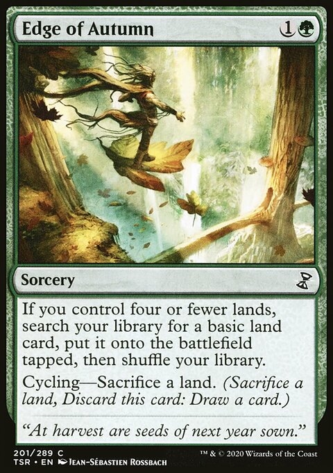 If you control four or fewer lands, search your library for a basic land card, put it onto the battlefield tapped, then shuffle. Cycling—Sacrifice a land. (Sacrifice a land, Discard this card: Draw a card.)