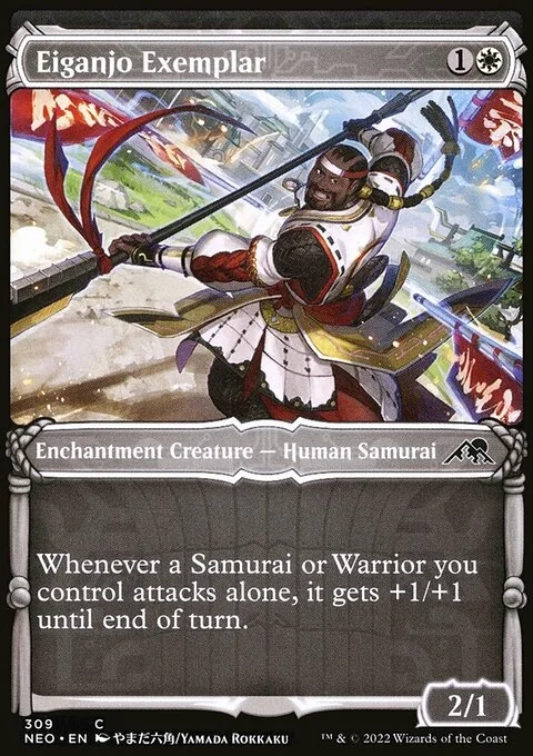 Whenever a Samurai or Warrior you control attacks alone, it gets +1/+1 until end of turn.