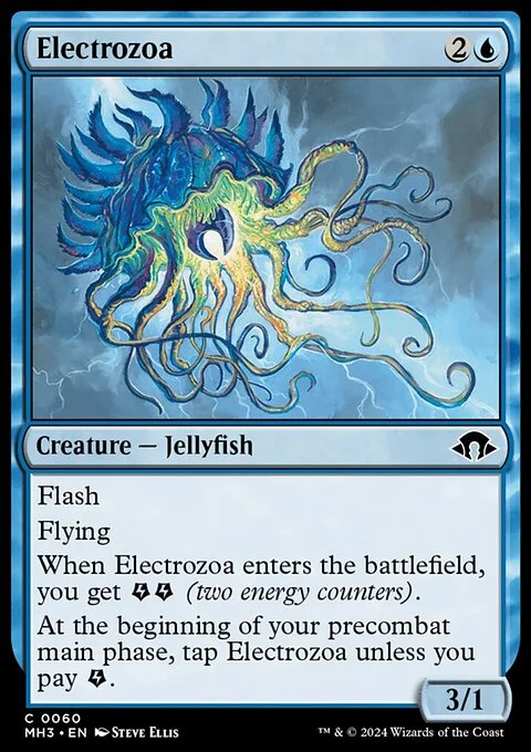 Flash Flying When this creature enters, you get {E}{E} (two energy counters). At the beginning of your first main phase, tap this creature unless you pay {E}.