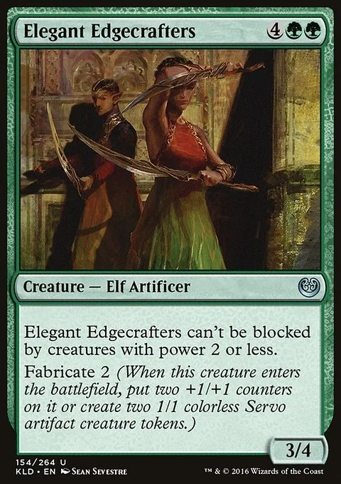 Elegant Edgecrafters can't be blocked by creatures with power 2 or less. Fabricate 2 (When this creature enters the battlefield, put two +1/+1 counters on it or create two 1/1 colorless Servo artifact creature tokens.)
