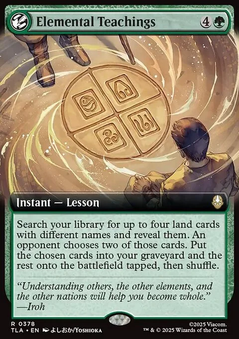 Search your library for up to four land cards with different names and reveal them. An opponent chooses two of those cards. Put the chosen cards into your graveyard and the rest onto the battlefield tapped, then shuffle.