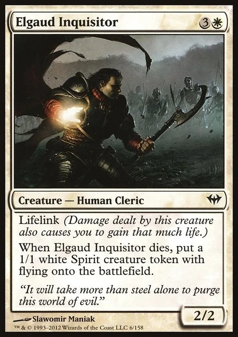 Lifelink (Damage dealt by this creature also causes you to gain that much life.) When Elgaud Inquisitor dies, create a 1/1 white Spirit creature token with flying.