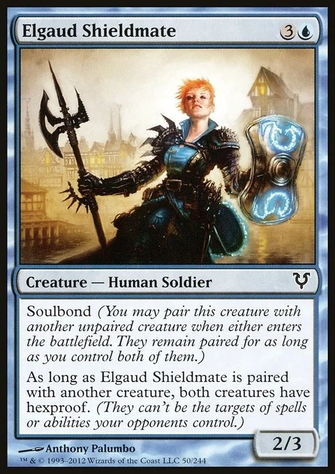 Soulbond (You may pair this creature with another unpaired creature when either enters the battlefield. They remain paired for as long as you control both of them.) As long as Elgaud Shieldmate is paired with another creature, both creatures have hexproof. (They can't be the targets of spells or abilities your opponents control.)