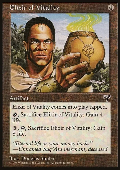 Elixir of Vitality comes into play tapped.tap, Sacrifice Elixir of Vitality: Gain 4 life.8, tap, Sacrifice Elixir of Vitality: Gain 8 life.