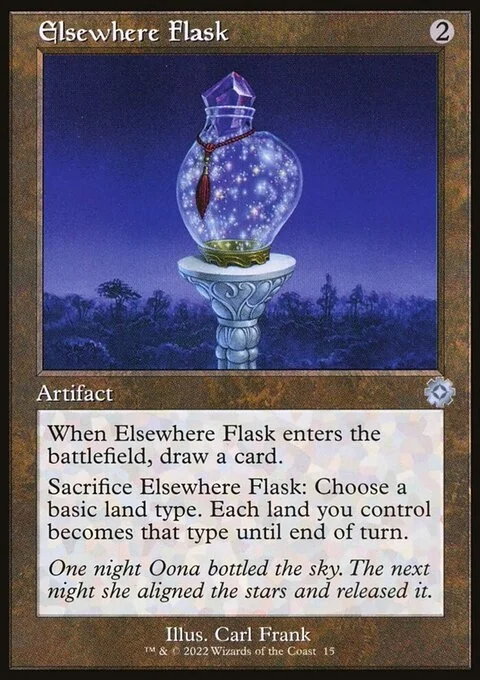 When Elsewhere Flask enters the battlefield, draw a card. Sacrifice Elsewhere Flask: Choose a basic land type. Each land you control becomes that type until end of turn.
