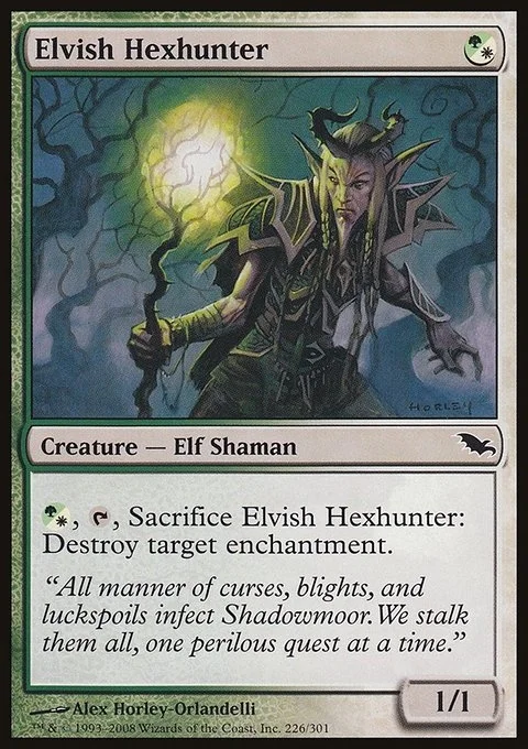 {G/W}, {T}, Sacrifice Elvish Hexhunter: Destroy target enchantment.