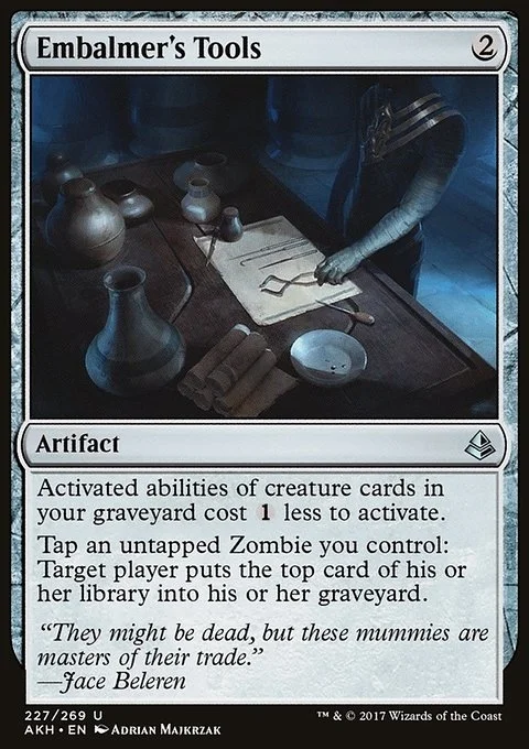 Activated abilities of creature cards in your graveyard cost {1} less to activate. Tap an untapped Zombie you control: Target player mills a card.