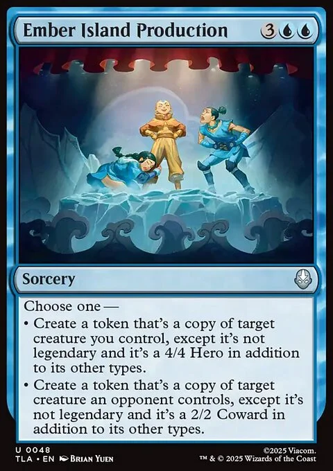 Choose one— • Create a token that's a copy of target creature you control, except it's not legendary and it's a 4/4 Hero in addition to its other types. • Create a token that's a copy of target creature an opponent controls, except it's not legendary and it's a 2/2 Coward in addition to its other types.