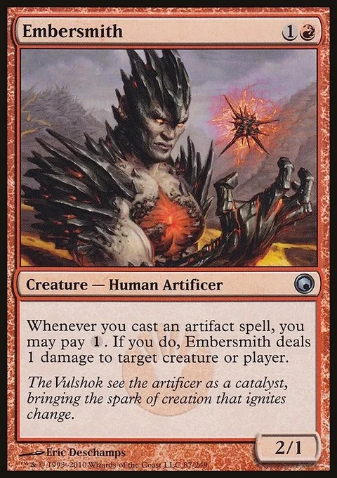 Whenever you cast an artifact spell, you may pay {1}. If you do, Embersmith deals 1 damage to any target.