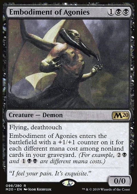 Flying, deathtouch Embodiment of Agonies enters the battlefield with a +1/+1 counter on it for each different mana cost among nonland cards in your graveyard. (For example, {2}{B} and {1}{B}{B} are different mana costs.)