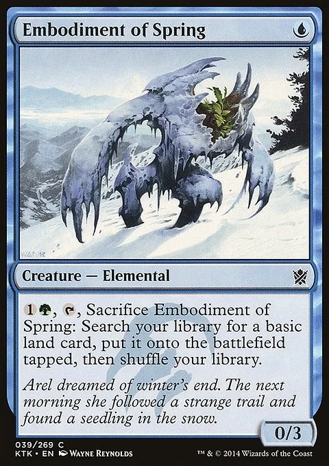 {1}{G}, {T}, Sacrifice Embodiment of Spring: Search your library for a basic land card, put it onto the battlefield tapped, then shuffle your library.