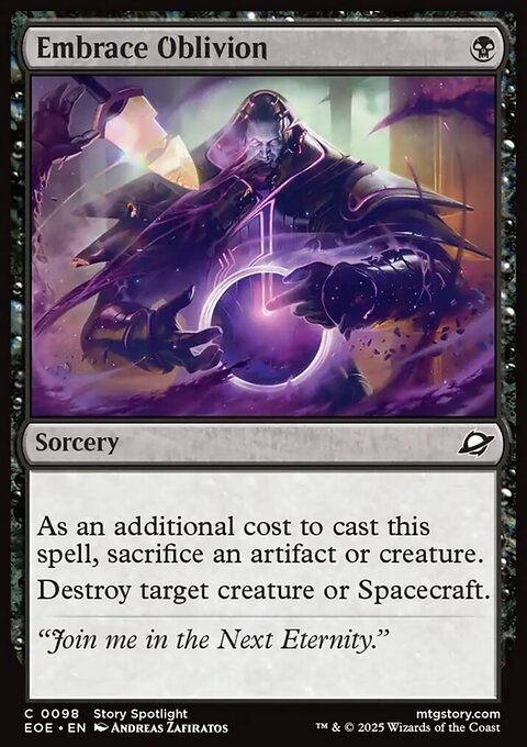 As an additional cost to cast this spell, sacrifice an artifact or creature. Destroy target creature or Spacecraft.
