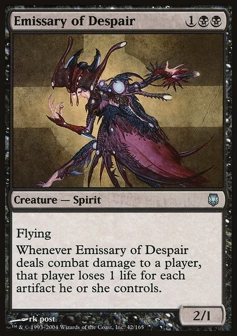 Flying Whenever Emissary of Despair deals combat damage to a player, that player loses 1 life for each artifact they control.