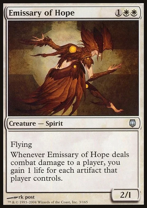 Flying Whenever Emissary of Hope deals combat damage to a player, you gain 1 life for each artifact that player controls.