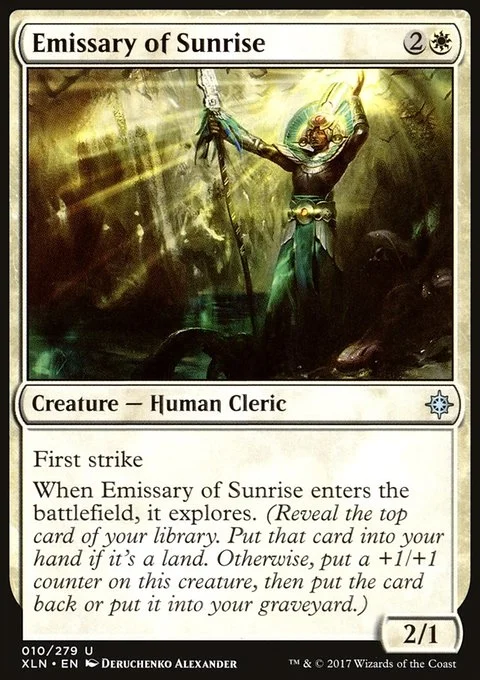 When Emissary of Sunrise enters the battlefield, it explores. (Reveal the top card of your library. Put that card into your hand if it's a land. Otherwise, put a +1/+1 counter on this creature, then put the card back or put it into your graveyard.)