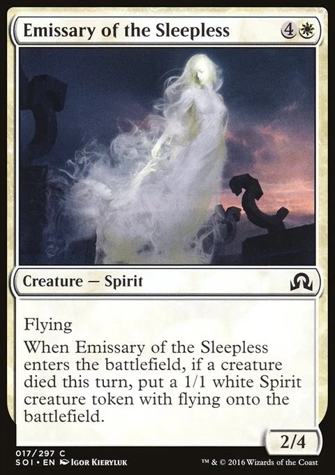 Flying When this creature enters, if a creature died this turn, create a 1/1 white Spirit creature token with flying.