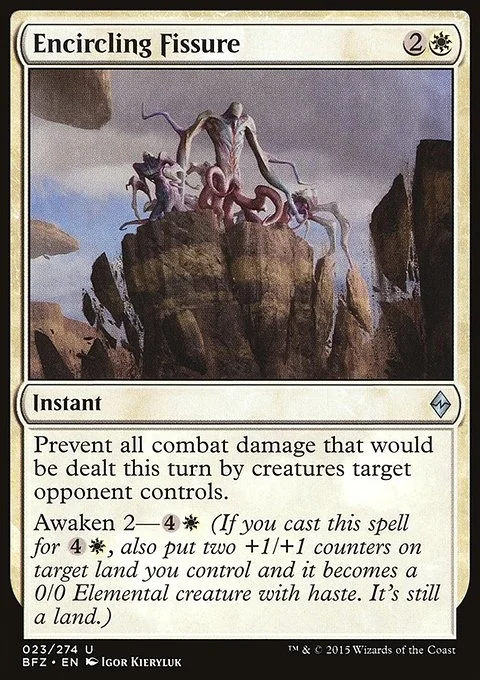 Prevent all combat damage that would be dealt this turn by creatures target opponent controls. Awaken 2—{4}{W} (If you cast this spell for {4}{W}, also put two +1/+1 counters on target land you control and it becomes a 0/0 Elemental creature with haste. It's still a land.)