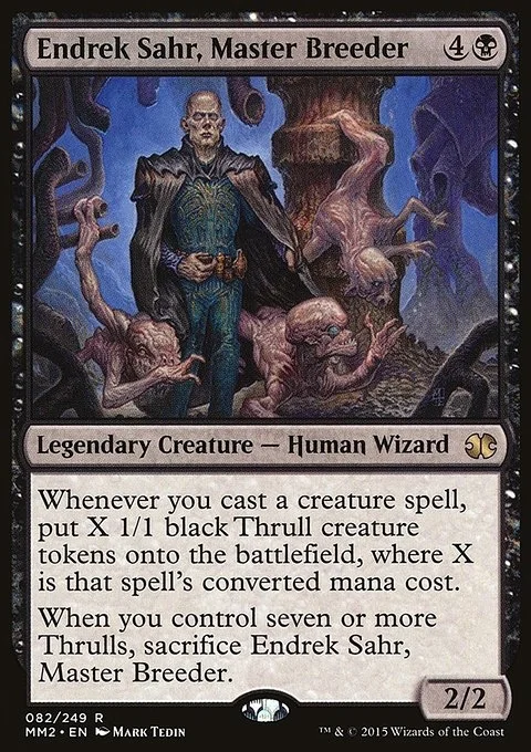 Whenever you cast a creature spell, create X 1/1 black Thrull creature tokens, where X is that spell's converted mana cost. When you control seven or more Thrulls, sacrifice Endrek Sahr, Master Breeder.